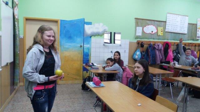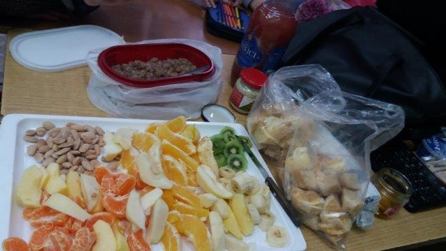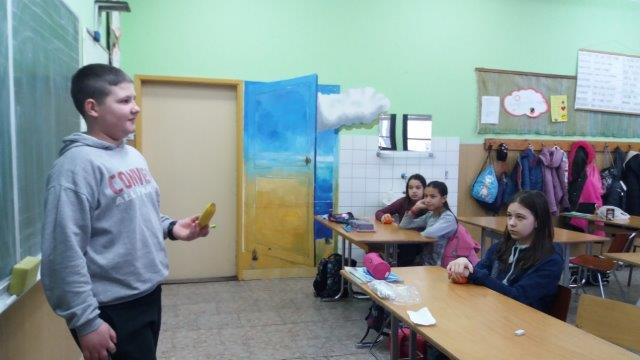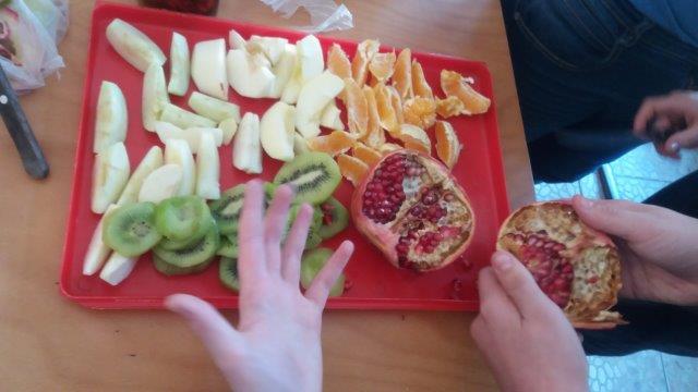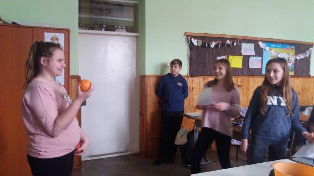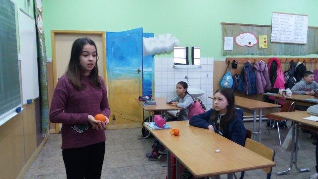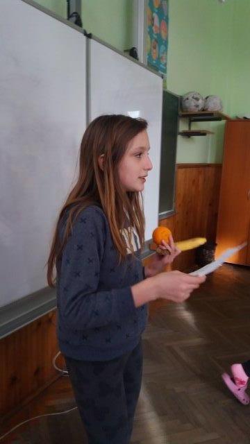 Egy zeneórán elég érdekes feladatot kaptunk, hogy hozzunk gyümölcsöket amilyet tudunk, vagy szeretünk és aki akar beszámolhat az adott gyümölcsről. Én hoztam egy mandarint és be is számoltam hogy milyen hasznos vitaminokkal rendelkezik( magas C-vitamin tartalom, laktató hatású,diétában fontos gyümölcs, benne találhatóolaj görcsoldó hatású.) A többiek is hoztak gyümölcsöt, Lilla is hozott egy mandarint, Johanna almát, Emma három kivit, Noémi is egy mandarint, Lili egy narancsot, Zoli meg Roli egy banánt. Ezeket mind megmostuk, megpucoltuk és azután megettük. Zoli beszámolt a banán jótékony hatásáról ( A, B, C,E, B6 vitaminokkal rendelkezik, jó a gyomorra és a töredezett hajvégekre) , Emma meg a kiwiről, hogy nagy mennyiségben A, B-, C- és K-vitaminokat tartalmaz. Napi három kivi fogyasztása csökkenti a magas vérnyomást. A tanárnő is hozott szezámmagot(amit őrölve a legjobb megenni és magas a kálcium tartalma), mandulát( lugosító hatású és lehet belőle tejet és lisztet készíteni) , mézes hajdinát és gluténmentes lisztből készült muffint. Megtudhattuk hogy szervezetünk elsavasodhat így megbetegszünk,de ha lúgos ételeket eszünk (mandulát,gyümölcsöket és zöldségeket) ezzel elkerülhetjük abetegségeket.