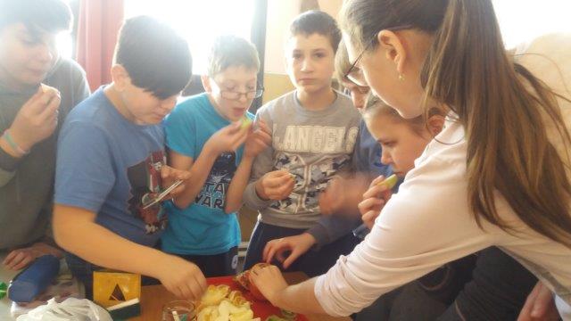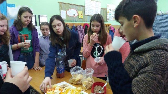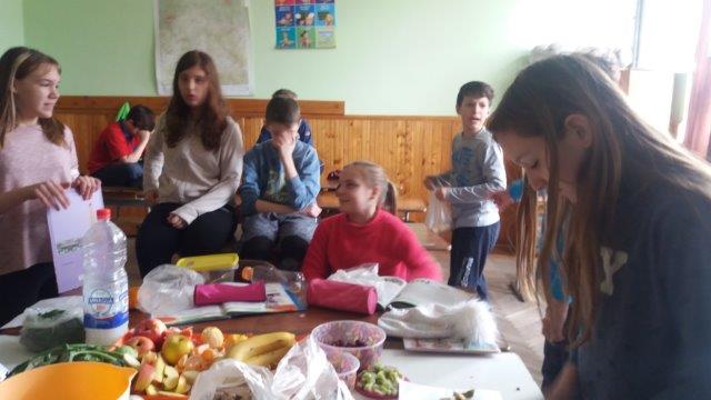 Egy pénteki napra az iskola zenetanárnője meghirdette, hogy egészséges nap lesz az egyik zeneórán. A hét minden napján gyüjtöttük a gyümölcsöket és zöldségeket. A várva várt péntek elérkezett. Az utolsó két óránk volt a zene, így az utolsó óra előtti szünetben előkészítettük a finomságokat egy tálcára. Beszámolót Evelin, Félix, Virág, Niki, Barbi és jómagam készítettük. A beszámolók nagyon érdekesek voltak, például a rukkoláról, mely csonterősítő, véd a ráktól,stb. A spenót B vitamint, folsavat, csökkenti a vércukrot, alkalmas keringési zavarok gyógyítására, szemünk épségére is alkalmas, lugosító hatású. A beszámolók meghallgatása után elkesztük elfogyasztani a vitaminokkal dús tálcát. A tálcán volt gránátalma, grépfruit, narancs, mandarin, dió, répa, spenót, banán, rukkola, alma. A tanárnő hozott kókusztejet, melyett megkóstolhattunk és elmondta miért jó megismerkedni a növényi tejjekkel, mert sok gyermek és felnőtt tejérzékeny. Elmondta a tejérzékenység tüneteit is. Azután megkóstolhattuk a gluténmentes lisztből készült muffin, ami többünknek nem tettszett, de szembesültünk azzal hogy sok lisztérzékeny embernek ez a mindennapi kenyere. A sok finomság elfogyasztása után hosszas takarítás következett. A takarítás után felöltöztünk, majd hazamentünk és vidáman gondoltunk vissza a vidám egészséges napra.