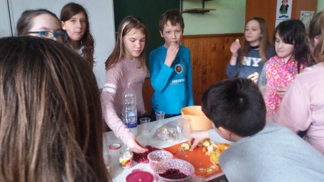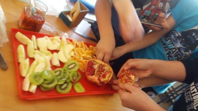 Három héttel ezelőtt csütörtökön két zeneóránk volt egy helyett és a tanárnő azt mondta hogyha hozzunk a következő zeneórán gyümölcsöket, akkor egy egészségnapot fogunk tartani. Máté gránátalmát, Petra pedig a Goji bogyót hozott, Adrián kiwit, a tanárnő pedig almát, narancsot,diót és gluténmentes muffint. Máté elmondta hogyha napi egy pohár gránátalmalét iszunk egy év alatt az érfali lerakódásokat csökkenti. Rendszeres fogyasztása vérnyomáscsökkentő és vérrögképződést gátló hatású, a vérhígítók és koleszterincsökkentők hatását növeli és lassítja a ráksejtek növekedését. Petra hozott saját termésű Goji bogyót, nagy mennyiségű C- vitamint tartalmaz, fiatalít, jó közérzetet biztosít. A tanárnőtől megtudtuk hogy a kiwiben is nagy mennyiségű C-vitamint tartalmaz, a dió koleszterin csökkentő, megakadályozza a vérrög képződést,javítja az inzulin termelést. A beszámolók után egy jót lakomáztunk az ínycsiklandozó gyümölcsökből és a gluténmentes lisztből készült muffin is finom volt. Jól éreztük magunkat és sokat beszéltünk és nevettünk együtt.