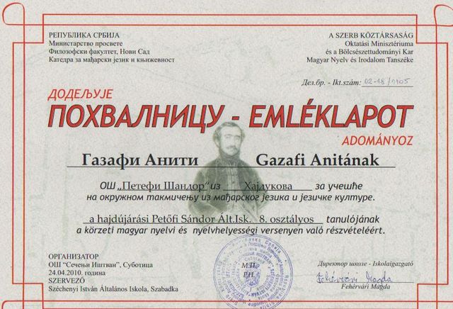 Gazafi Anita királyhalmi 8. osztályos tanuló továbbjutott a körzeti magyar nyelvi és nyelv helyességi versenyen a köztársasági versenyre, amelyet Szabadkán a Szécsényi István Általános Iskolában tartanak. Gratulálunk Anitának, és sok sikert a továbbiakban